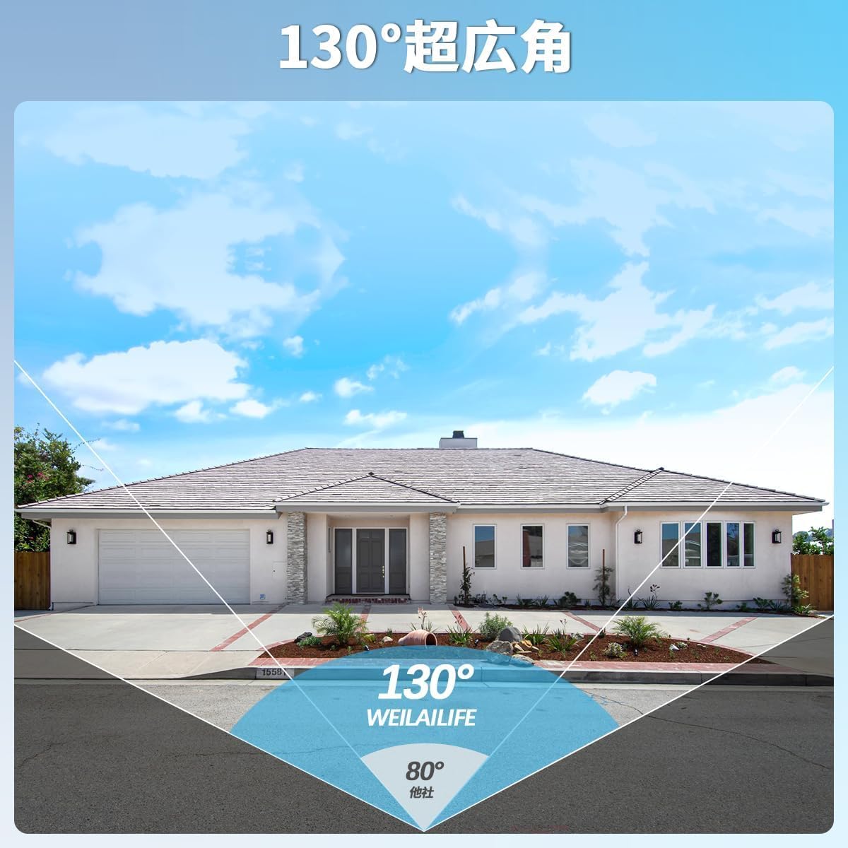 - {130° 超広角 & 400万超高画素} 130°の広視野角で鮮やかに撮影しながら録画し、隅々まではっきり監視できます。特定の場所には細かくチェックできます。多層レンズを備えた光学広角レンズは、約 130° の広い視野角を提供し、監視エリアの行き止まりを減らします。400万超高解像度セキュリティカメラは、24 時間年中無休で人や家の安全を確保します。夜でも24メートル以内のすべてのものを見ることができます。IR-LED システムは、暗い場所で赤外線モードを自動的に有効にします。