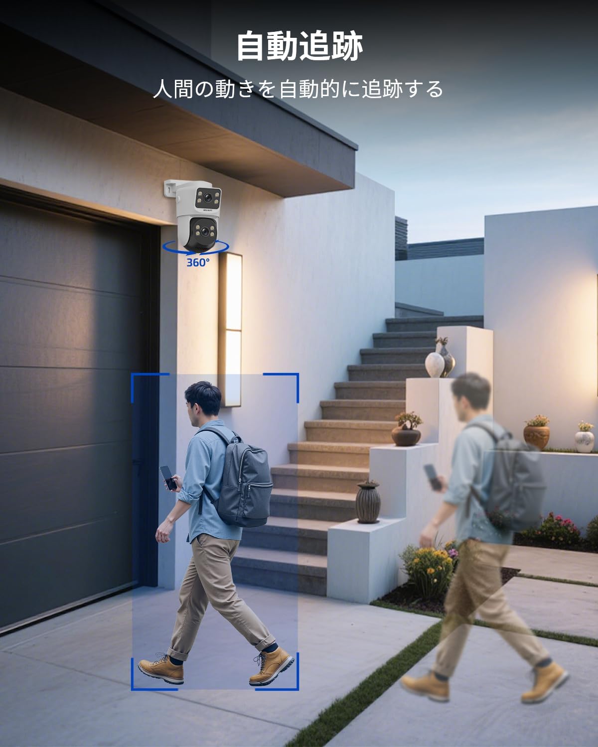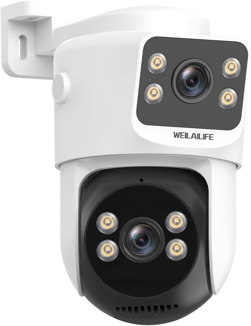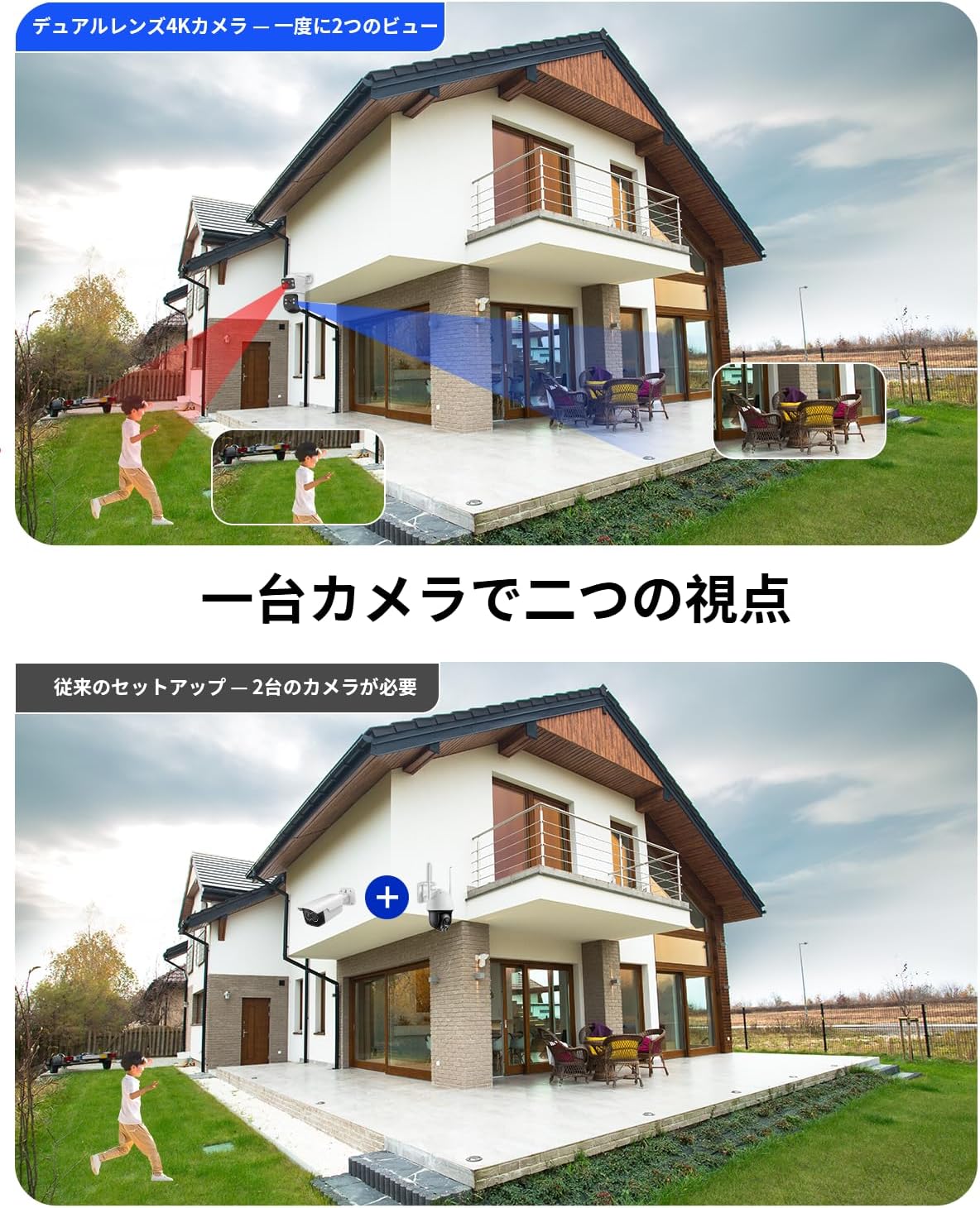 - {デュアルレンズ&パン/チルト} デュアルレンズ搭載で、2つの異なるエリアを同時に監視可能。 広範囲を1台でカバーし、死角を最小限に抑えます。複数カメラを設置する必要がなく、コスト削減にもつながります。水平355度、垂直90度の広範囲をカバーする回転機能を備えており、家のどの角度からでも監視が可能です。これにより、家の安全を一層強化できます。