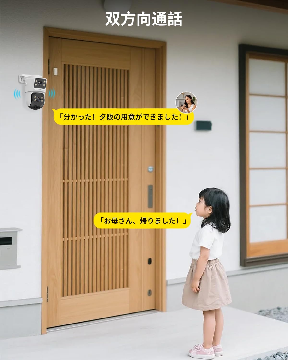 - {双方向通話} 内蔵マイク&スピーカーで、スマホからその場にいるように通話が可能。 玄関先での応答や、遠隔からの声かけにも便利です。外出先からでも家の中の家族やペットに声をかけることができます。これにより、まるで家にいるかのような安心感を提供し、コミュニケーションも取りやすくなります。