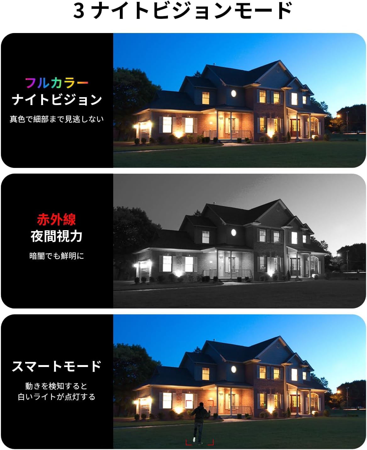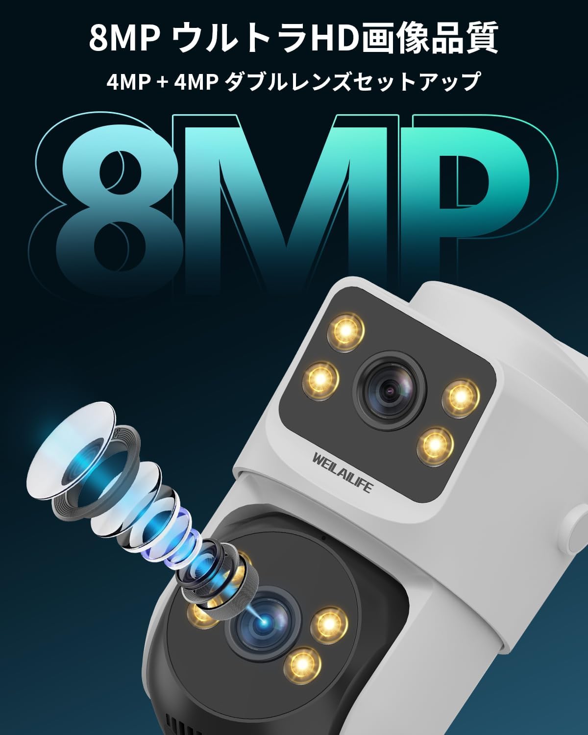 - {800万画素&夜間も鮮明映像} 800万画素(8MP)の高解像度で細部までクリアに撮影。 赤外線暗視+白色LEDによるフルカラーモードも搭載し、夜間も安心です。