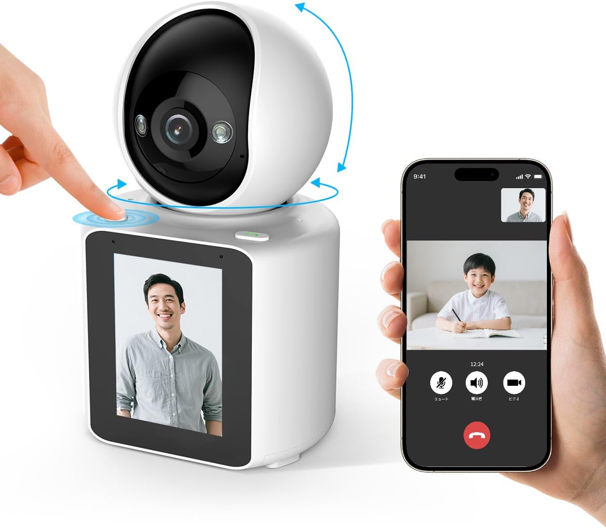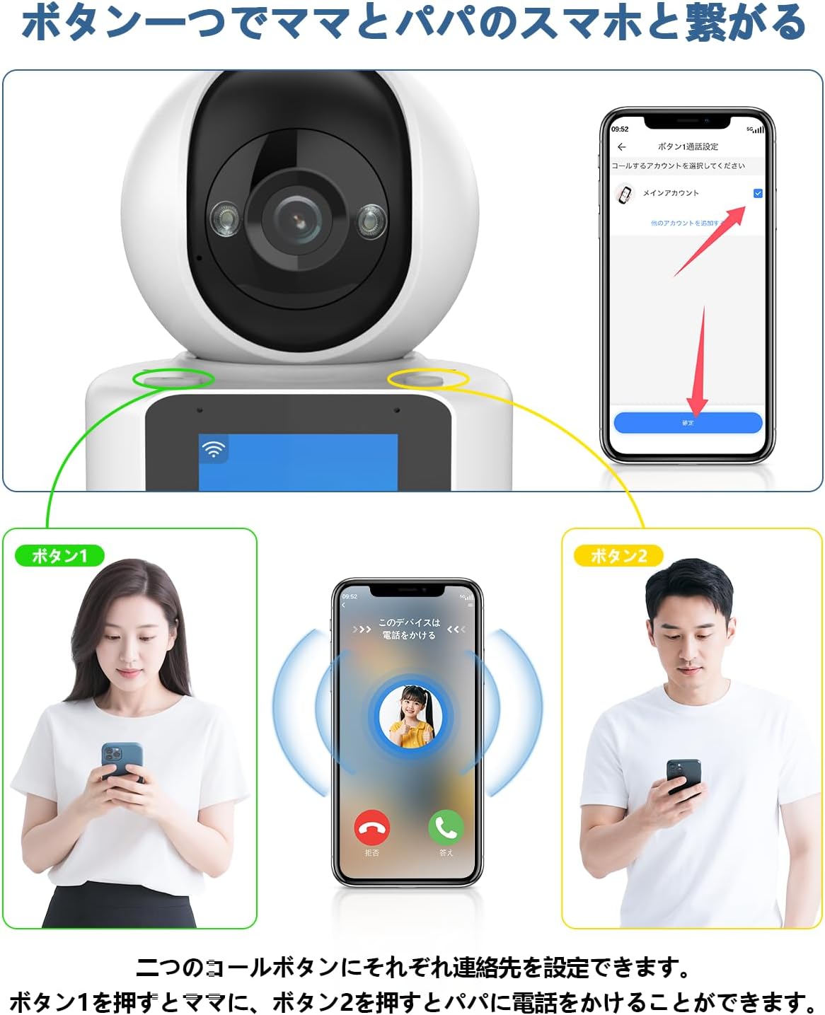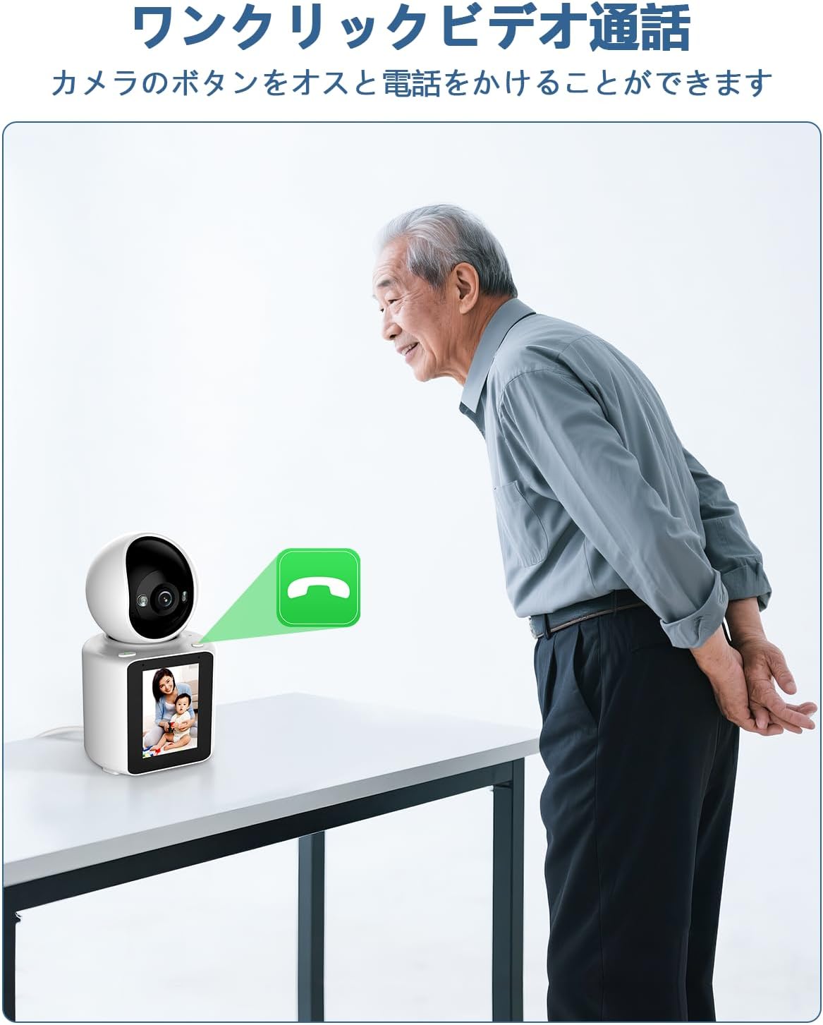- {ワンタッチコール機能} この見守りカメラはワンタッチコール機能を搭載しています。ワンタッチコール機能とは、カメラのボタンを一度押すだけで、登録されたスマートフォンに直接通話を発信できる便利な機能です。この機能により、緊急時や困ったときにすぐに家族やケアスタッフと連絡を取ることができます。シンプルな操作で安心・安全をサポートします。