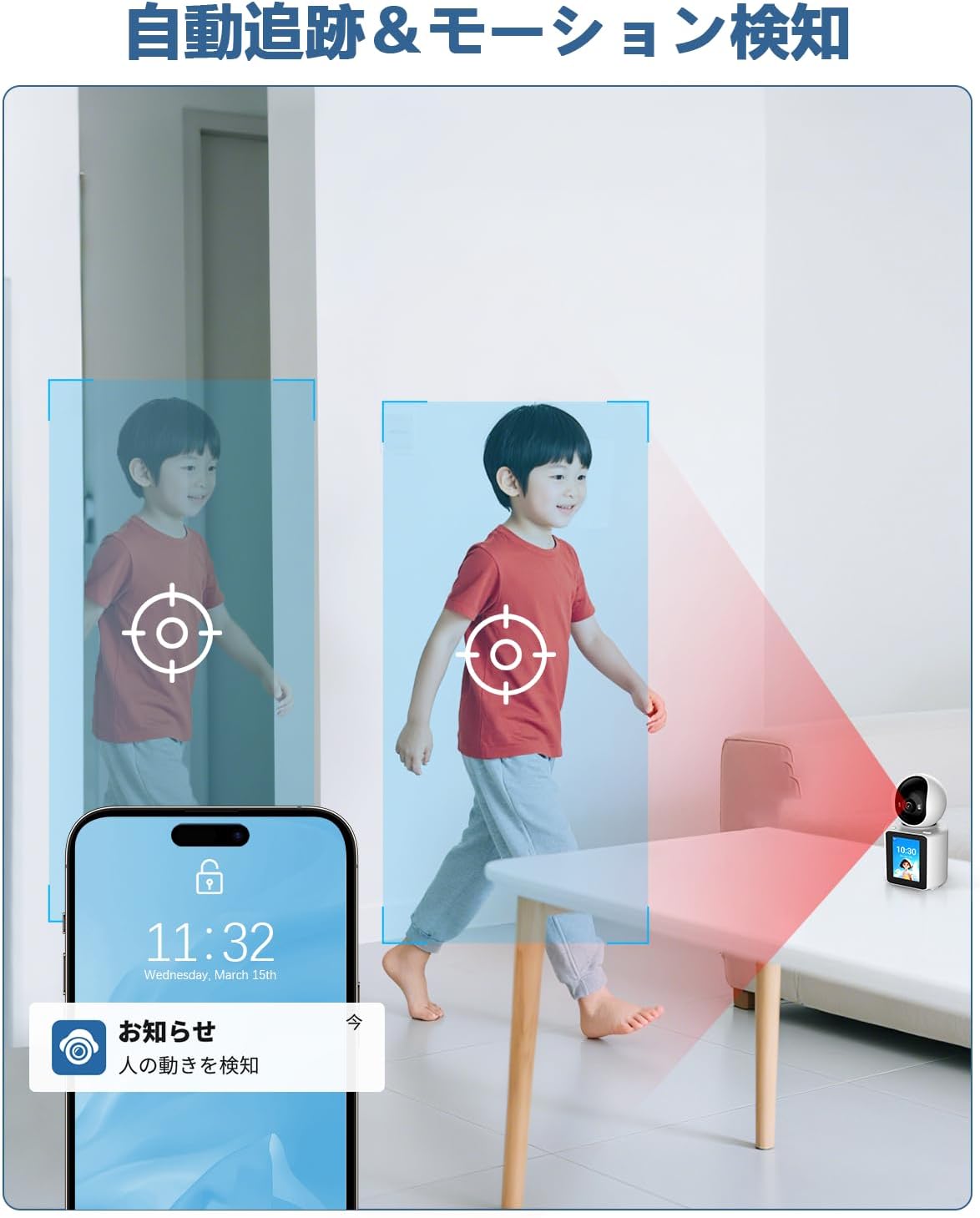- {自動人型追跡} このカメラは、動く人型を自動的に検知し、その動きに合わせてレンズが回転するため、広範囲を無人で効率的に監視することが可能です。例えば、高齢者の介護やお子様が遊ぶ姿も逃さず捉えます。