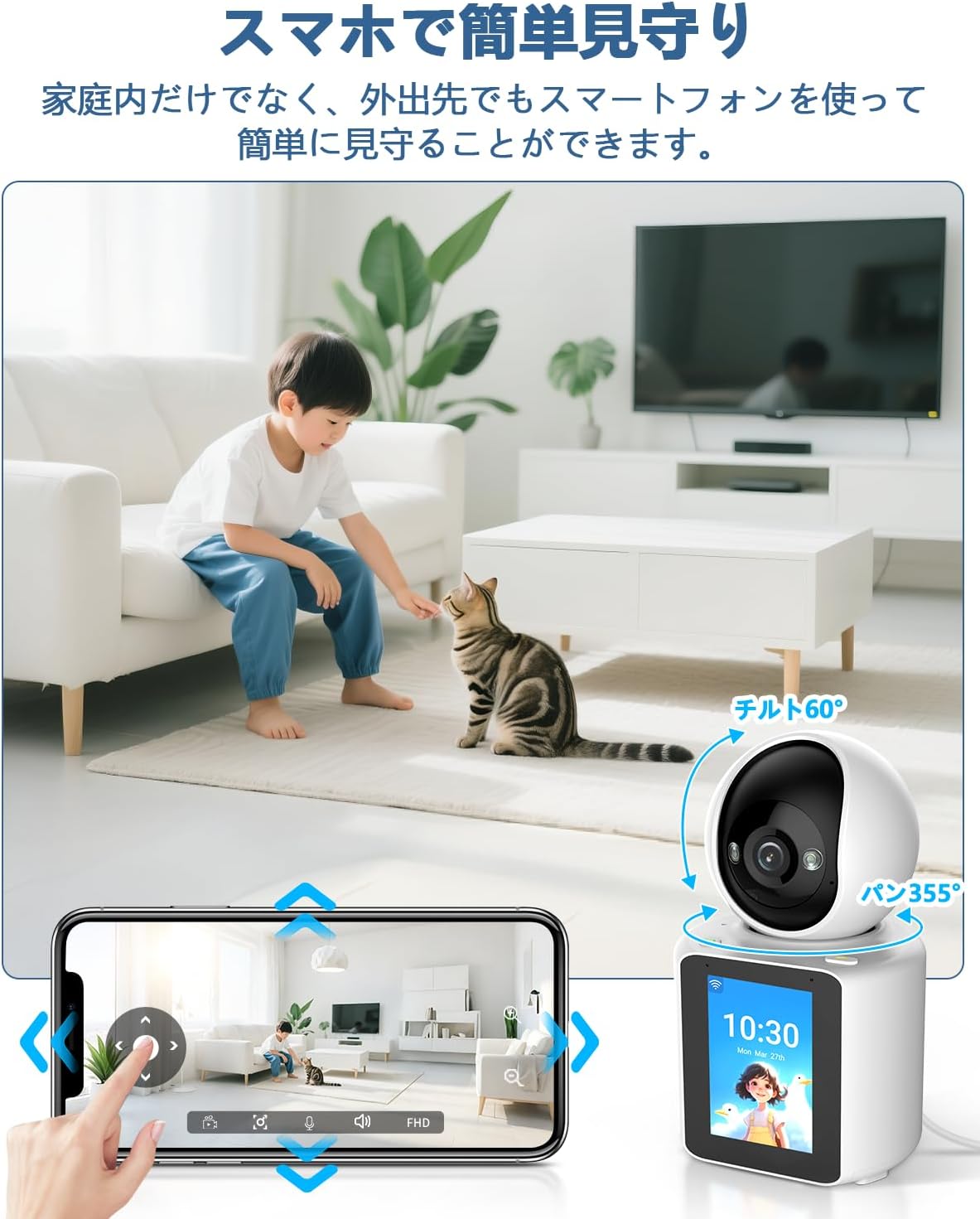 - {水平355° 垂直60°} 水平355度、垂直60度の広範囲をカバーする回転機能を備えており、家のどの角度からでも監視が可能です。これにより、家の安全を一層強化できます。