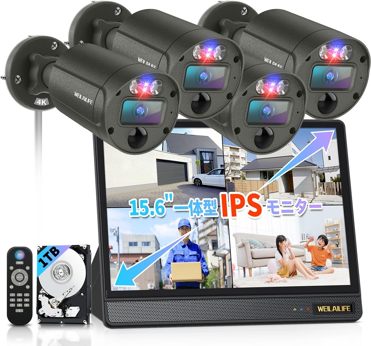 【800万画素・双方向通話・赤青ランプ警告】 WEILAILIFE 有線 poe給電 防犯カメラセットランキング 屋外 poe 防犯カメラ 防犯カメラシステム 屋内 防犯カメラセット 4台 モニター付き一体型録画機