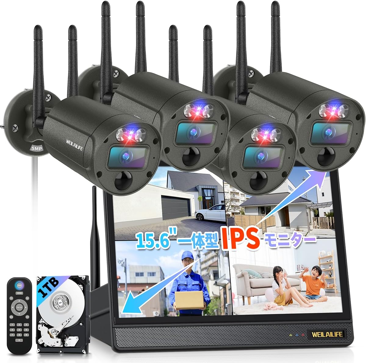 【双方向通話・赤青ランプ警告・130° 超広角】WEILAILIFE 防犯カメラセット ワイヤレス 屋外屋内 4台 無線 監視カメラシステム セキュリティカメラ 15.6インチモニター付き一体型録画機 ネットワーク スマホ対応
