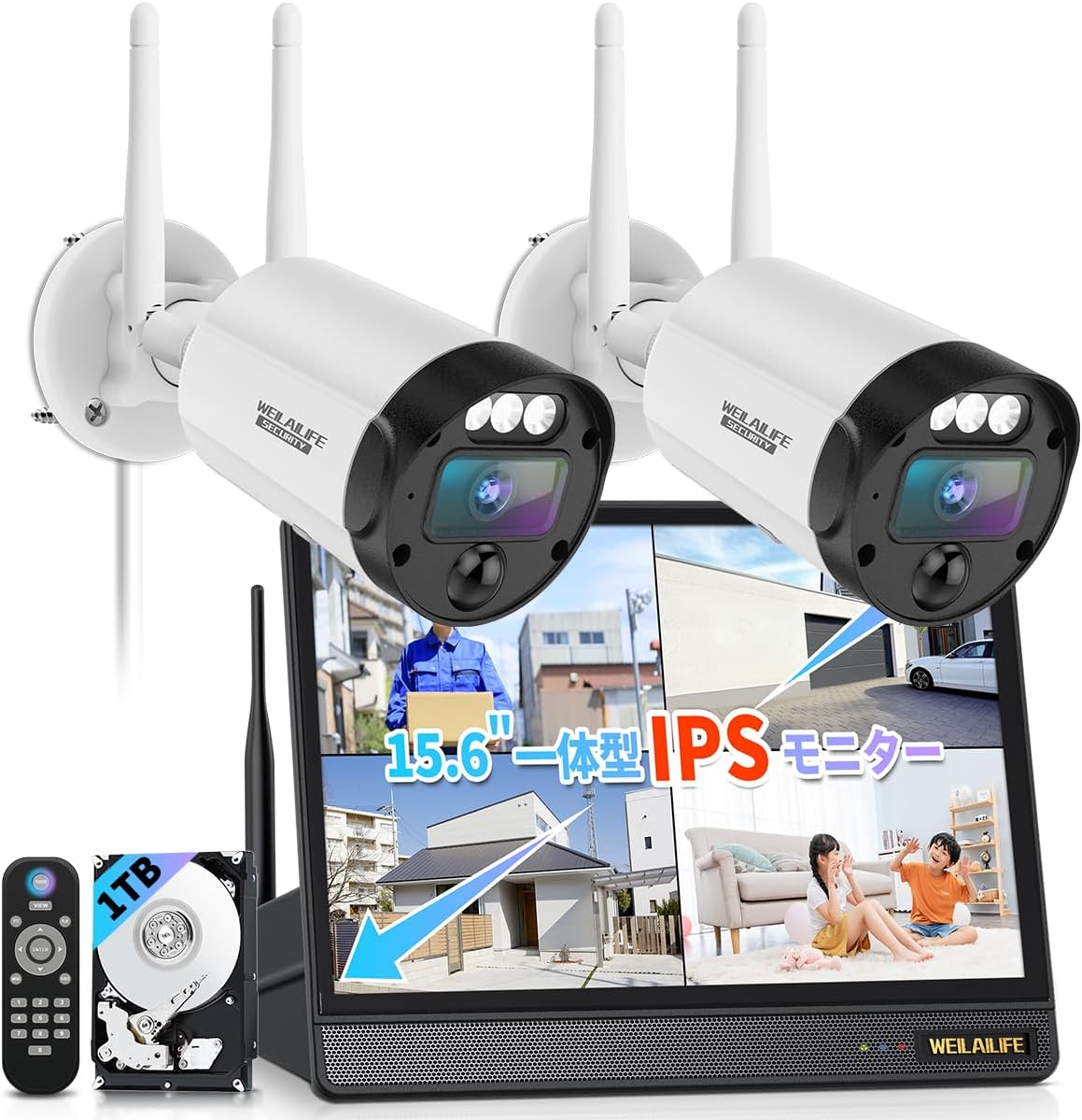 【双方向通話・ダブルアンテナ信号強化・130° 超広角】防犯カメラセット 2台 屋内 屋外 ネットワークワイヤレス 監視カメラ・録画機セット モニター付き一体型 セキュリティ対策 スマホ対応 無線